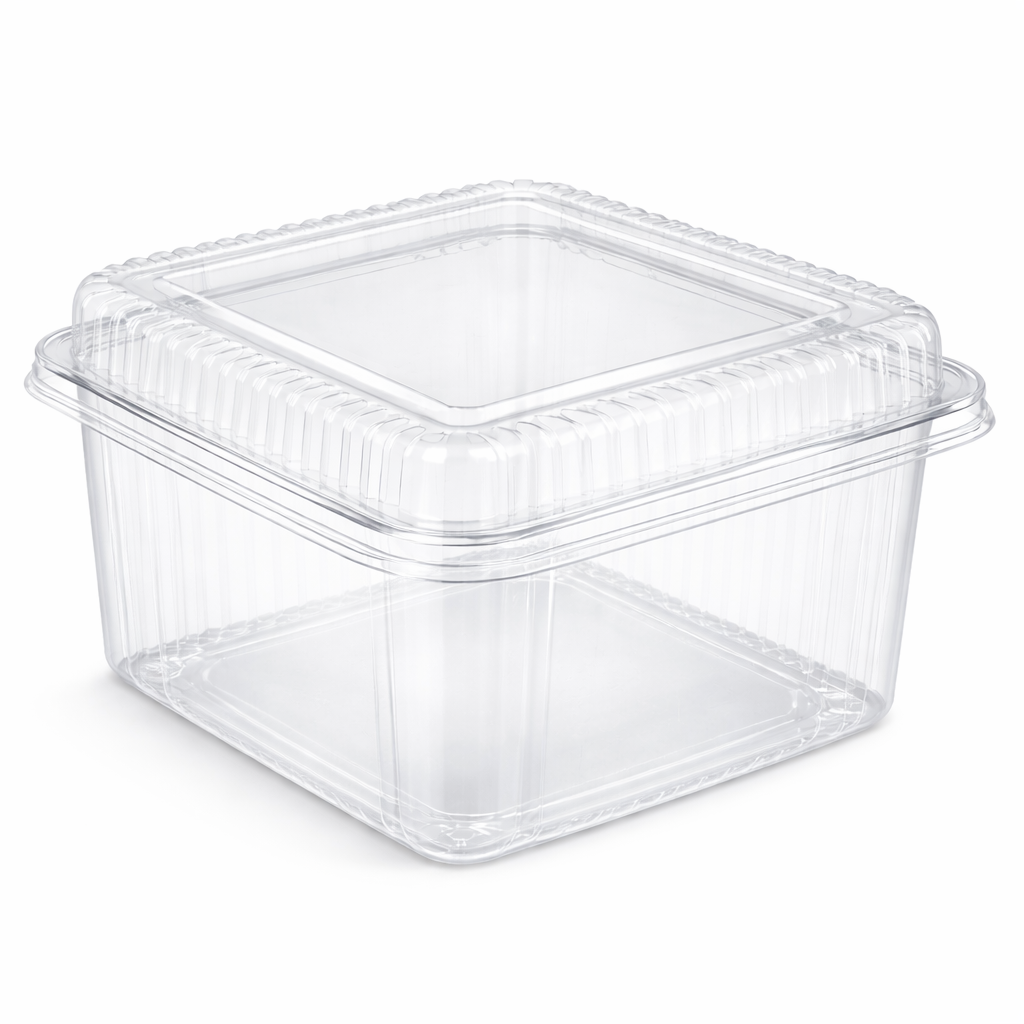 Fabricada em plástico transparente resistente, permite visualizar o conteúdo interno, valorizando a apresentação do produto. Seu formato quadrado alto proporciona melhor acomodação de sobremesas em camadas, sendo muito utilizada por confeitarias, padarias, docerias e serviços de delivery.