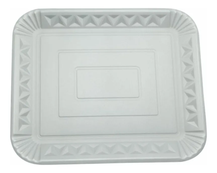 Fabricado em EPS (isopor), é leve, resistente e descartável, garantindo facilidade no uso e descarte. Seu formato retangular com borda reforçada proporciona melhor acomodação dos alimentos.
